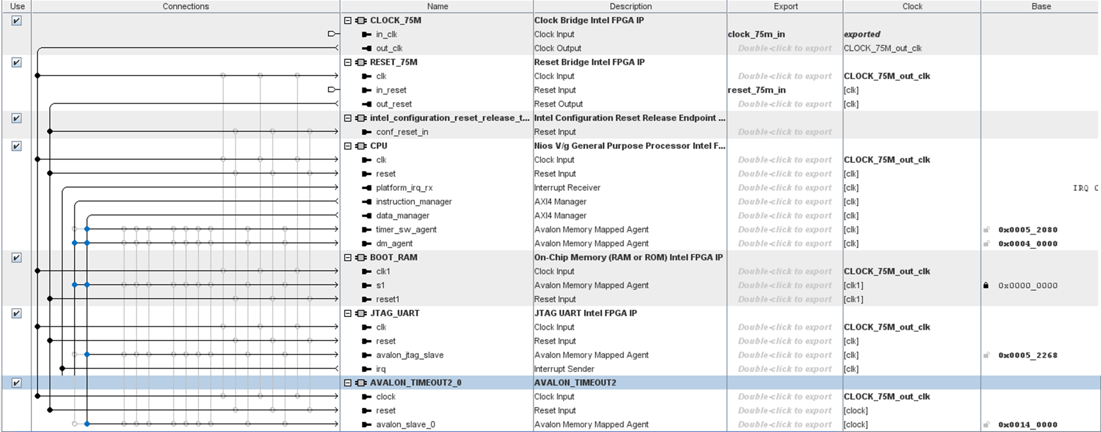 I try to make the thing simple. The connection my own module avalon_timeout2 to the Nios V CPU in the platform design as show in the pic (PD.png)