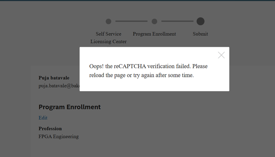 I am trying to enroll for NIOS V license, but it gives me error message as a reCAPTCHA Verification failed.
