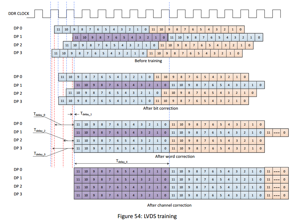 As shown, the training is divided into bit correction、word correction and channel correction. The sensor development board uses the xilinx FPGA, which uses iodelay, bitslip and shift_register to complete 3 corrections.