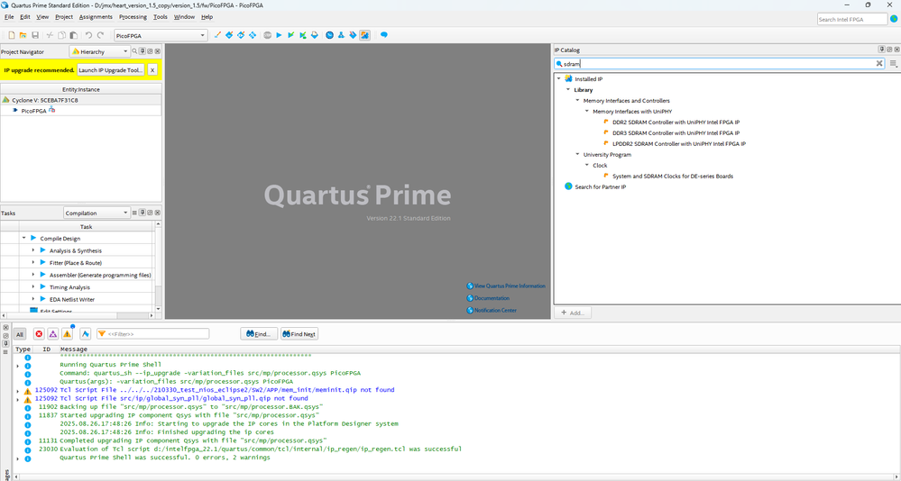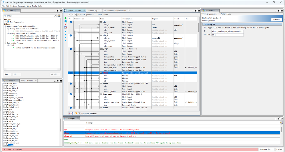 I have installed Quartus Prime 22.1 Standard, but I still cannot find the IP altera_avalon_new_sdram_controller in the IP Catalog as you can see on the right side of Fig1. Meanwhile, this IP still appears as Missing when I open a .qsys file that contains it (Fig2).