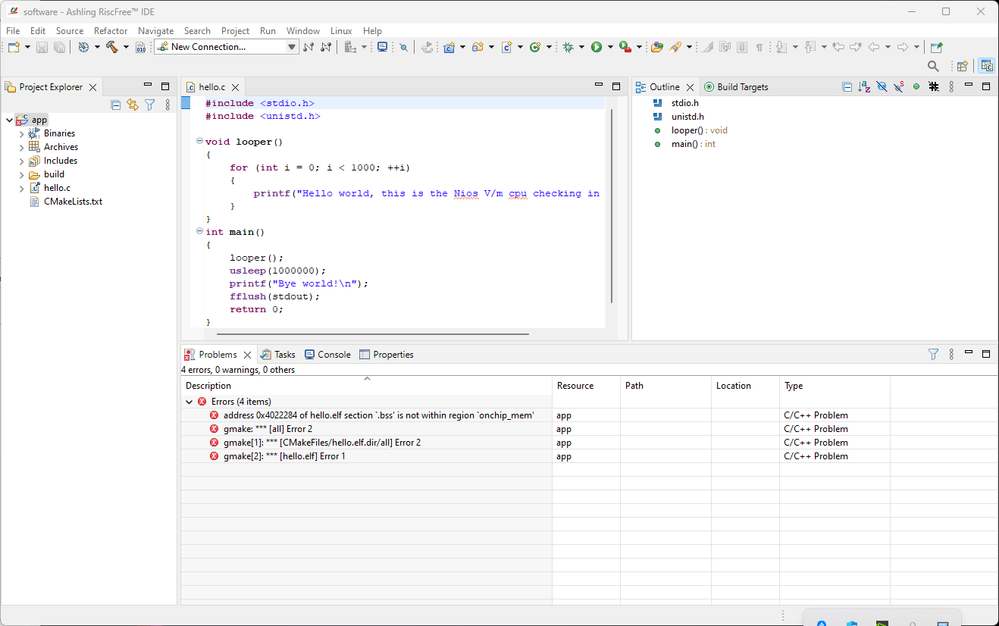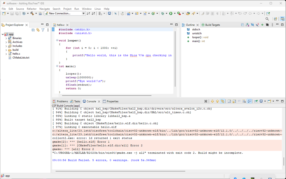 4) In Riscfree, build the project. In this case, I see that this fails with the error seen in Test1 above. Close RiscFree.
