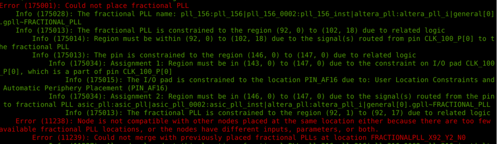 Error (11238): Node is not compatible with other nodes placed at the same location either because there are too few available fractional PLL locations, or the nodes have different inputs, parameters, or both.