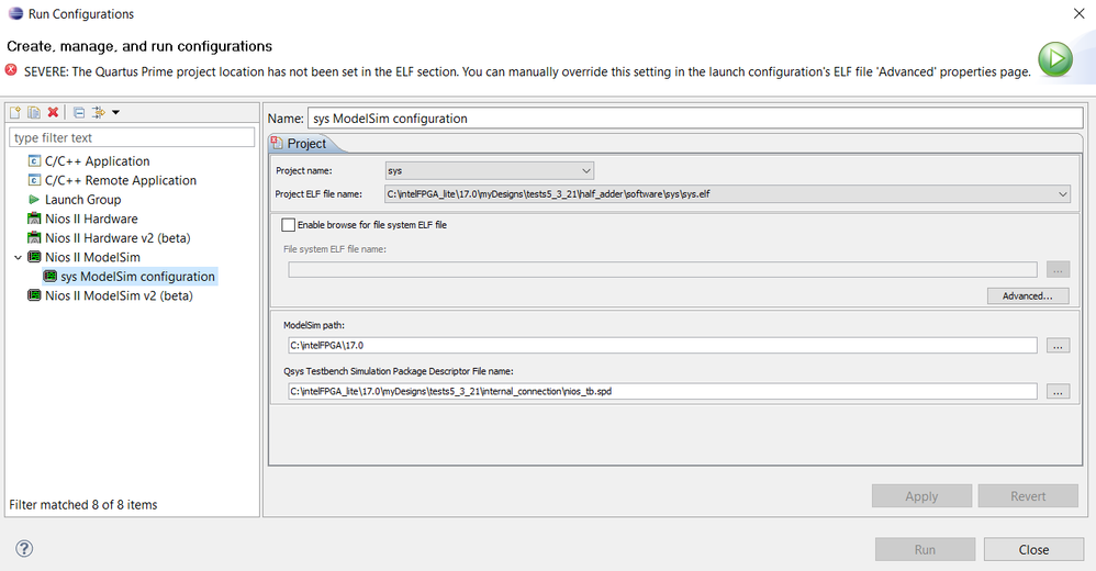 Hi all, I've been having trouble running my Eclipse systems as Nios II ModelSim. Running as Nios II hardware is okay for me. I am using the same .elf file that was working with the hardware simulation. Here are my run configurations, I'm not too sure where my error is: