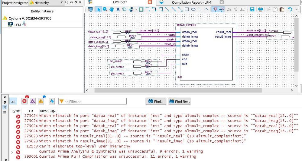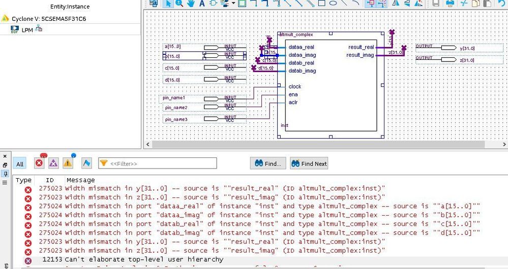 I'm trying to implement ALTMULT_COMPLEX for complex numbers, However, when I came to implement the circuit, it shows that all input sizes are mismatch. Can you please help with that? an image is attached.