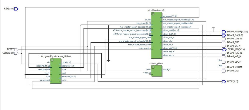 Is here anyone who have experience in using DE1-SoC SDRAM and Avalon interface? I have attached a screenshot for my system design in Platform Designer, my top-level (qsys_lab.v) and sub-level (HistogramEqualization_MM.v) Verilog module, including the Avalon-MM FSM, and the state diagram of the FSM. I really appreciate for all the help, thank you!System Design in Platform DesignerRTL netlist viewerFSM State Machine
