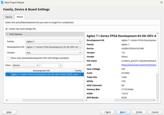 I tried the below thing both on Quartus Prime Pro 25.1 and Quartus Prime Pro 24.1. When i am creating the project with the board, i am not able to find it in available devices.