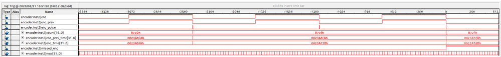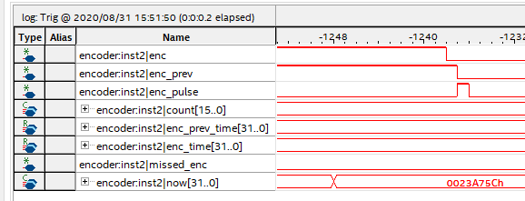 This image shows a signal tap of most of the block's signals. At just after t=-1280, there is a negative edge, the enc_pulse is taken high, but the count is not incremented, the enc_prev_time and enc_time are not updated.