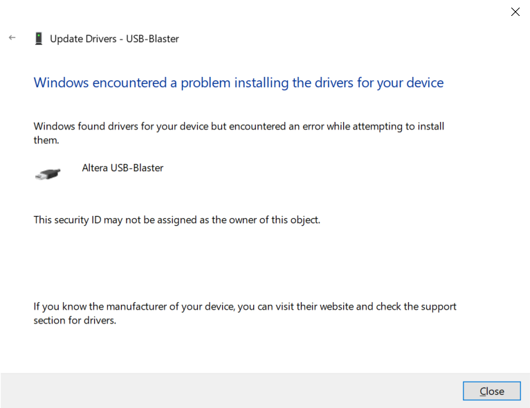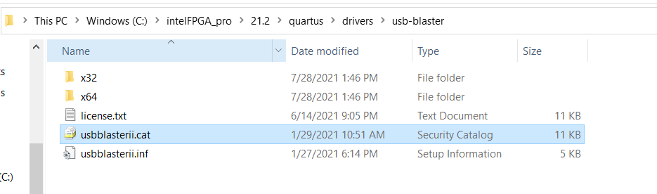 I am giving device manager update driver the path: 'C:\intelFPGA_pro\21.2\quartus\drivers\usb-blaster' and getting the following error message.