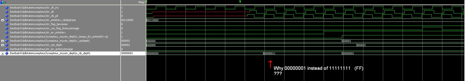 I have a problem in my software program. My goal is to put the following signal s_nb_deph to X"FF" Here is an ectract of the software: ELSIF RISING_EDGE(clk) then IF (En_enteteRX ='1' AND v_tempo_En_enteteRX ='0')AND v_en_finmesurereflecto ='0' THEN v_attente_nbdeph :='1'; ELSIF v_attente_nbdeph = '1' THEN v_cptdeph := "000001"; ELSIF v_cptdeph = "000001" AND v_cptdeph <= En_enteteRX_nbdeph THEN v_nb_deph <= X"01"; v_attente_nbdeph := '0'; v_flag_nbdeph :='1'; ELSE v_flag_nbdeph := '0'; v_en_finmesurereflecto :='0'; v_attente_nbdeph := '0'; v_en_actmoyennage:= '0'; v_nb_deph <= X"FF"; --HERE MY PROBLEM, this value doesnt' change to FF.....only X"03" END IF; --temporisations v_tempo_flag_moyennagetermine := flag_moyennagetermine; v_tempo_En_enteteRX := En_enteteRX ; ELSIF FALLING_EDGE(clk) then cpt_deph <= v_cptdeph; nb_deph <= v_nb_deph; -- So this output is not updated to the right value flag_nbdeph <= v_flag_nbdeph ; en_finmesurereflecto <= v_en_finmesurereflecto; en_actmoyennage <= v_en_actmoyennage; END IF; END PROCESS; I declared in entity all the input and output, in the begining of the process all the variables. I have tried to change variable by signal (as you can see in the sreenshot attached...) But when I do the simulation on ModelSim Altera,the signal v_nb_deph (or s_nb_deph) goes to x"00" to X"03 and then to X"01". It seems like if the 2 bits on 8 are activated. I don't know what is the problem. In my project I use Quartus 2 Can somebody tell what's the problem.