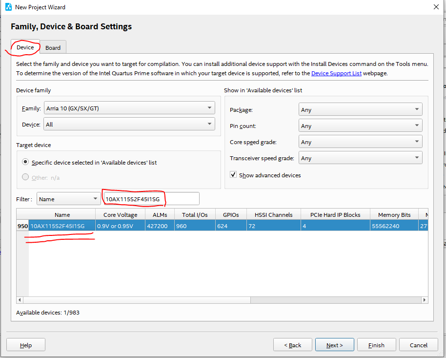 I installed Quartus 19.4 Pro and I'm able to find the 10AX115S2F45I1SG under the "Device" table in the "New Project Wizard".
