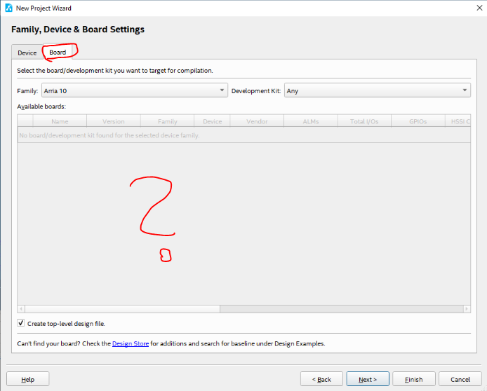 However, when I navigate to the "Board" tab - I can't see the DK-DEV-10AX115S-A (or any other board for that matter).