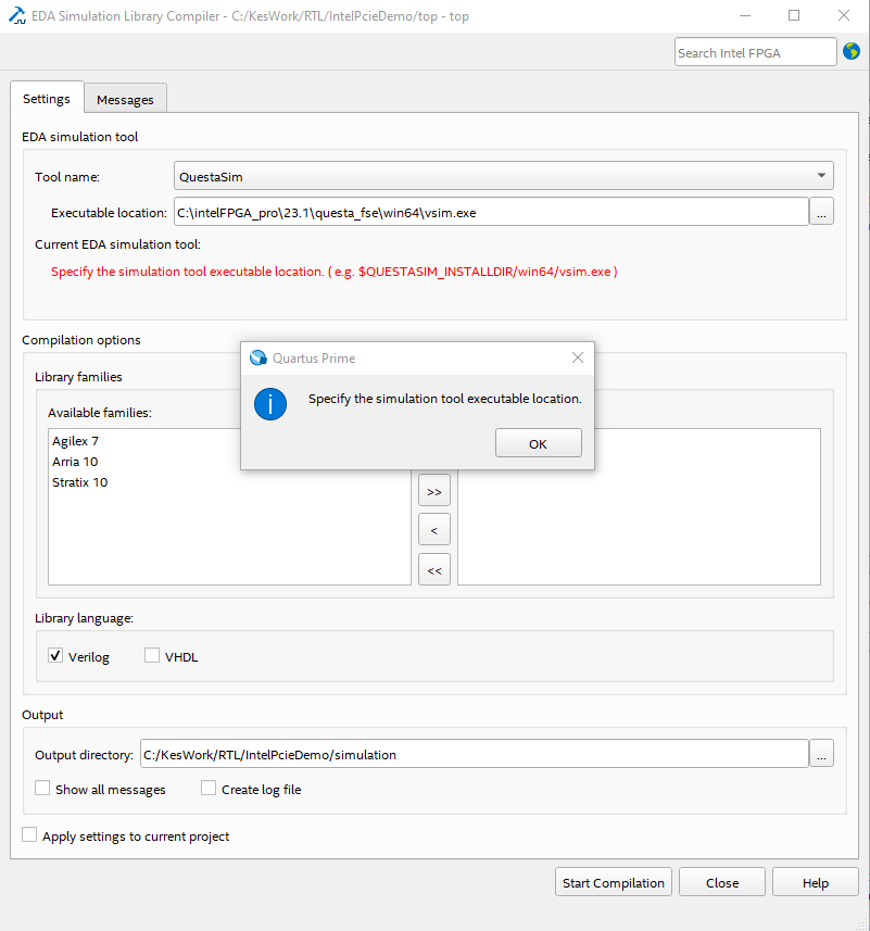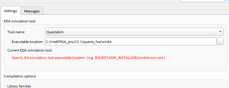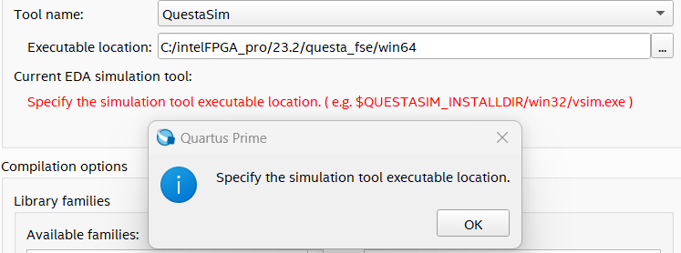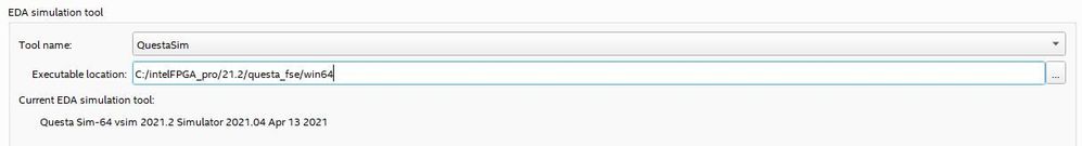 I fill in executable location (map) C:/intelFPGA_pro/22.2/questa_fse/win64