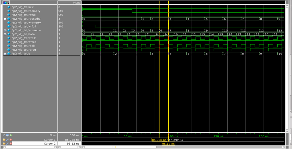 For the same rdclk and wrclk signal, the rdclk and rdreq are high at 85.028ns and the output changes at 95.12ns.