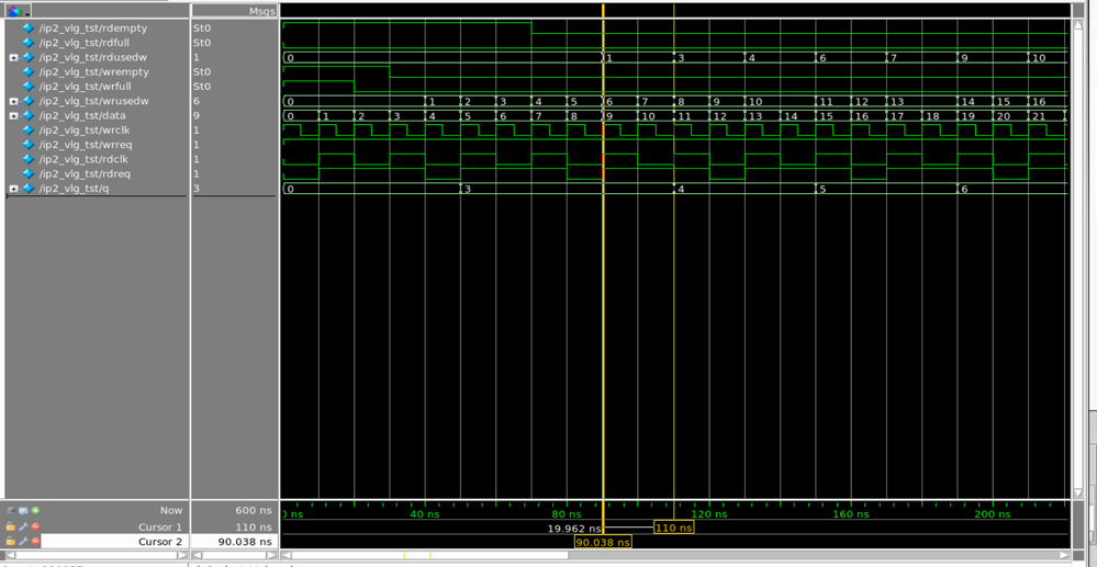 For different wrclk and rdclk signal, the rdclk and rdreq are high at 90.038ns and the output changes at 110ns.