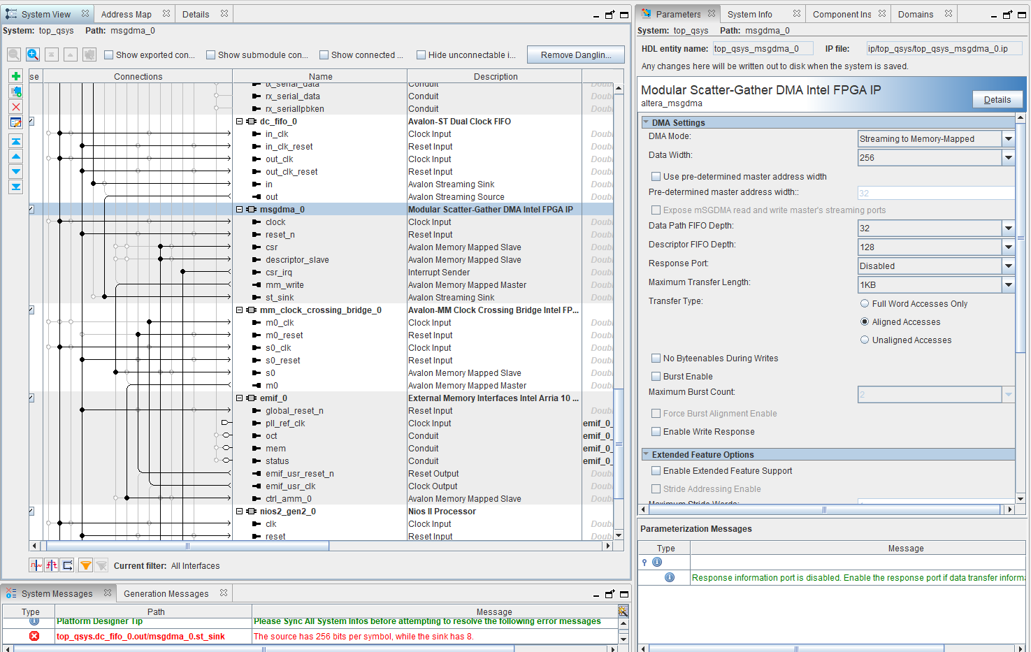 I am building a project aimed at saving data from the JESD204 interface to DDR4 memory using the msgDMA module.