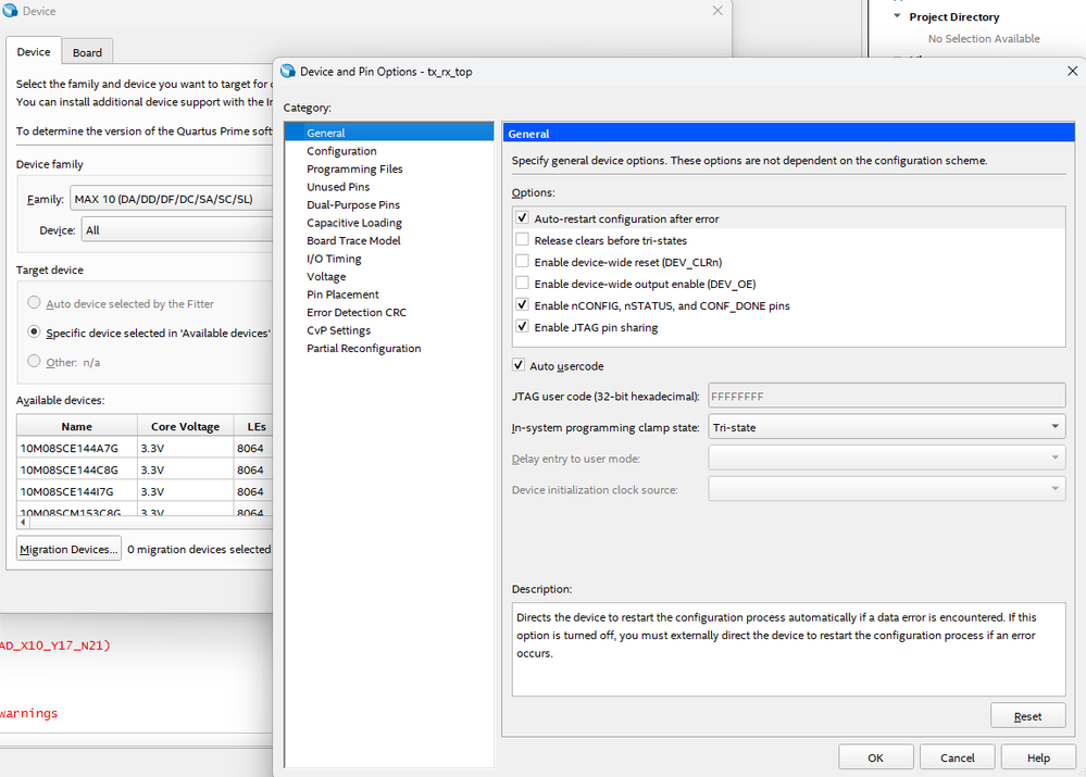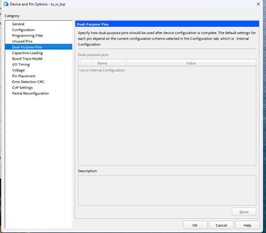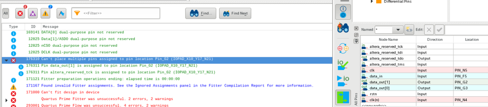 If i follow the guidelines I could be able top open assignment-->Device-->Device and Pins Options-->Dual-purpose pins , but the config scheme is "Internal Configuration" and the "Dual-purpose Pins" tab is empty. (So, I can not follow this solution: https://forums.opalkelly.com/t/multiple-pin-assignments-error/1336)