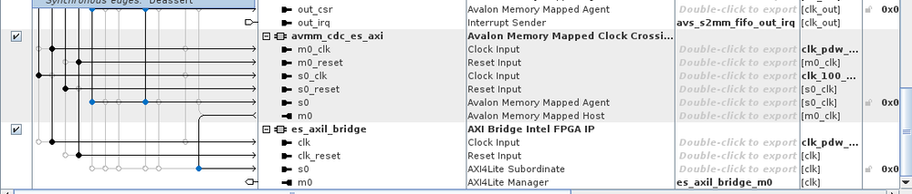 Finally, I connect the master interface of the AVMM CDC IP to the slave interface of the AXI bridge Intel FPGA IP and export the master to the top level.
