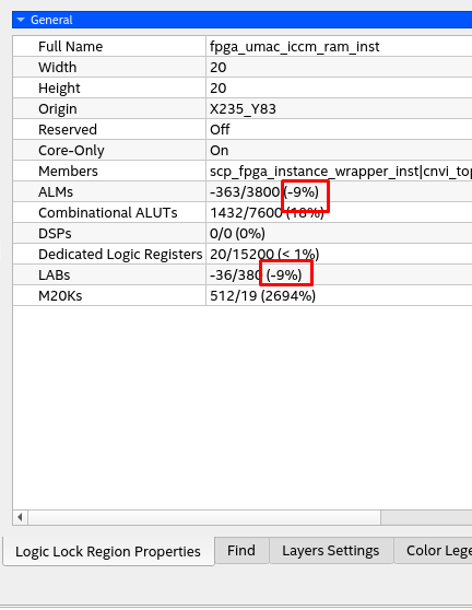 But the logic lock region properties tab show same utilization of resources even though part of them is occupied.
