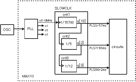 It has 3 counters. cnt1 divides 10 MHz clock counting 15700 to make PLS1r57ms clock. cnt2 divides PLS1r57ms clock counting 5 to make PLS7r85ms clock. And cnt3 divides PLS7r85ms clock counting 12 to make PLS94r2ms clock.