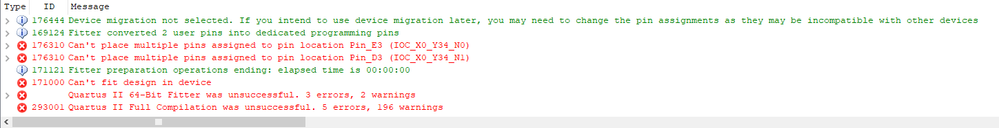 "Error (176310): Can't place multiple pins assigned to pin location Pin_E3 (IOC_X0_Y34_N0) Info (176311): Pin ASDO is assigned to pin location Pin_E3 (IOC_X0_Y34_N0) Info (176311): Pin ASDO is assigned to pin location Pin_E3 (IOC_X0_Y34_N0)."