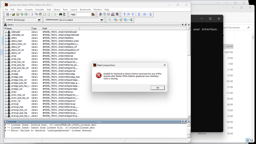 I don't know if we get a special badge for answering our own questions and solving our own problems but I got Questa running. It did turn out the the licensing system was happier with using the active wi-fi NIC physical address that I guessed would solve the problem. On the licensing system apparently you can't get a new license issued on the same computer by staring over again, but if you are the verified system admin on that computer you can edit the NIC physical address. I am not completely sure why my first entry did not work but after using the new license file that was sent to me within minutes, running the software as and administrator, and getting the LM_LICENSE_FILE variable set to the new license file then it works. So to sum it up if you get the NIC address wrong somehow you can edit the physical address ID as the verified system administrator for the computer that is to be licensed on the online Intel Licensing service. As for the question of could there be another problem the answer in this case was simple, just get the ID number right.