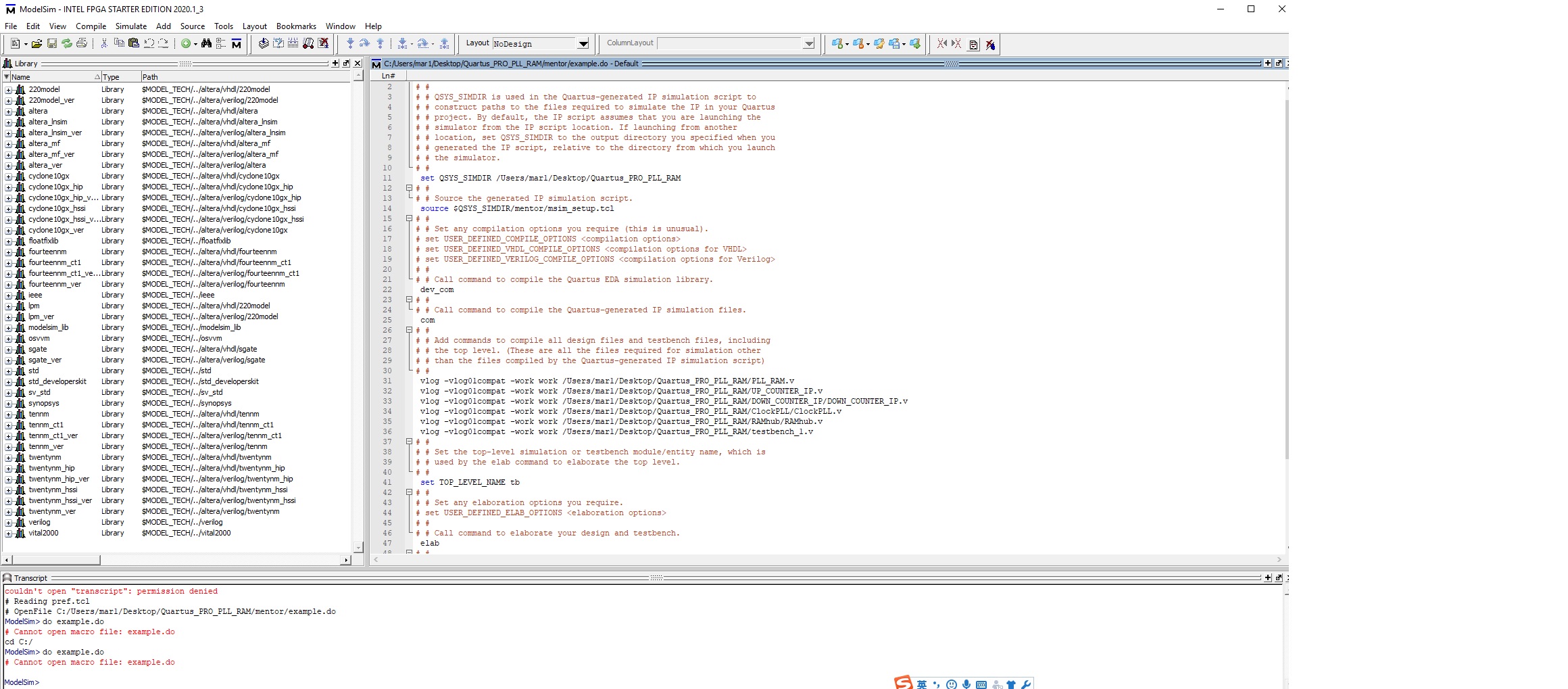 The reason why you cannot open macro file: example.do is most probably your Modelsim directory path is currently not located at /Users/mar1/Desktop/Quartus_PRO_PLL_RAM/mentor - where the example.do file located.