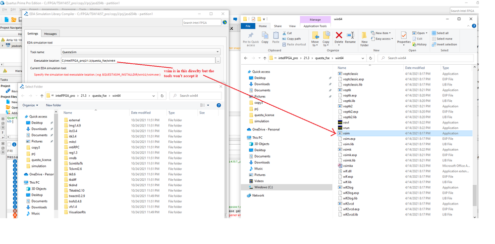I am learning how to use Quartus Pro, under tools-> launch simulation library compiler, I filled the executable location correctly. I confirmed that the vsim is there. but the tools keep asking me to "specify the simulation tools executable location. this really confuse me.