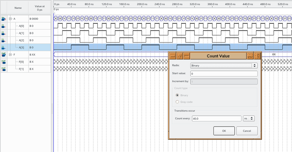 You can't use count value "count every" on bundled signals in vector waveform simulator. That only works on single bit signal. Check image: