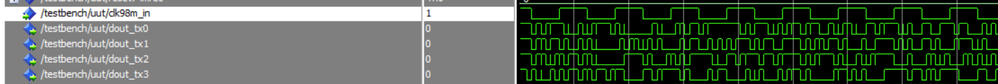 When simulating the ALTGX transceiver Using Questa or Modelsim PE I am seeing glitches on the Tx output waveform. Is this expected? After a rising edge of the data the glitch appears as a narrow pulse 1 serial clock cycle. In the simulation the channel corresponding dout_tx0 has a constant input value.