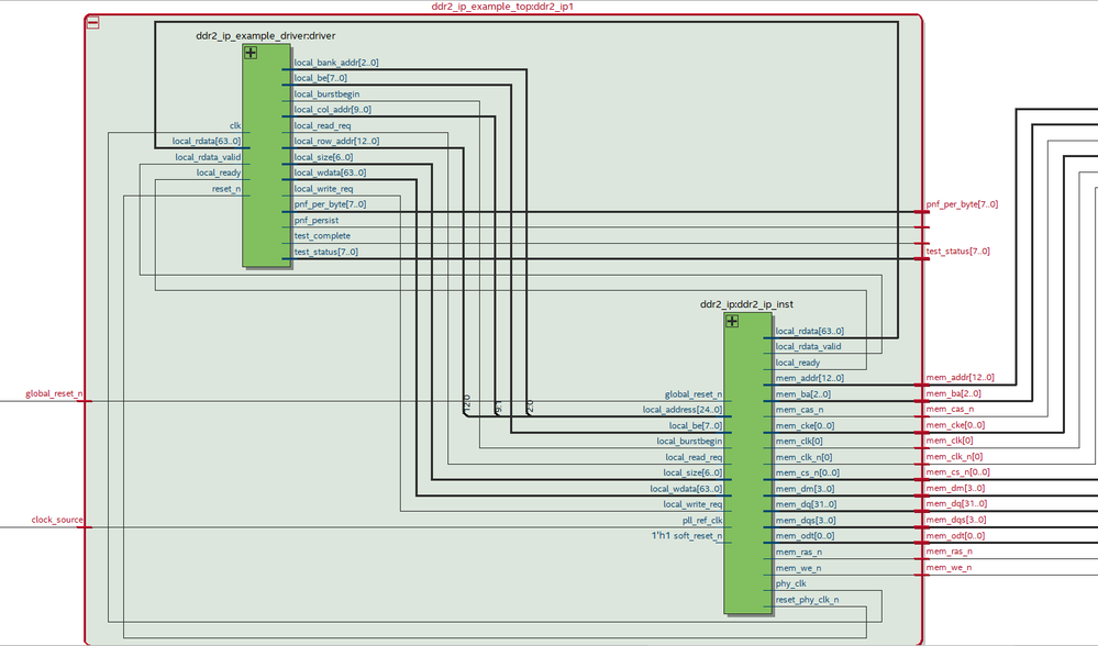 The following picture shows the instantiated DDR2 IP. Is the subsequent control for data transmission and storage primarily handled by ddr2_ip_example_driver (without modifying ddr2_ip_inst)?