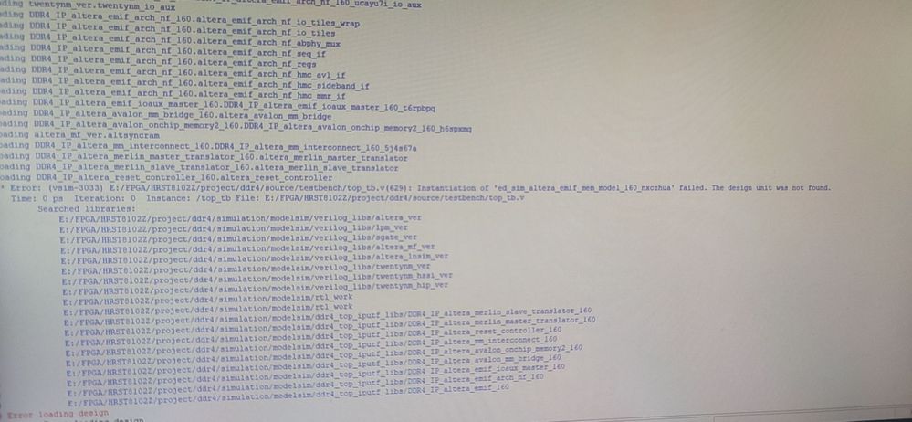 我把自己的testbench文件以及DDR4模型文件都加了进来,选用的modelsim是 modelsim-altera,但是我在进行仿真的时候,modelsim出现了如下错误