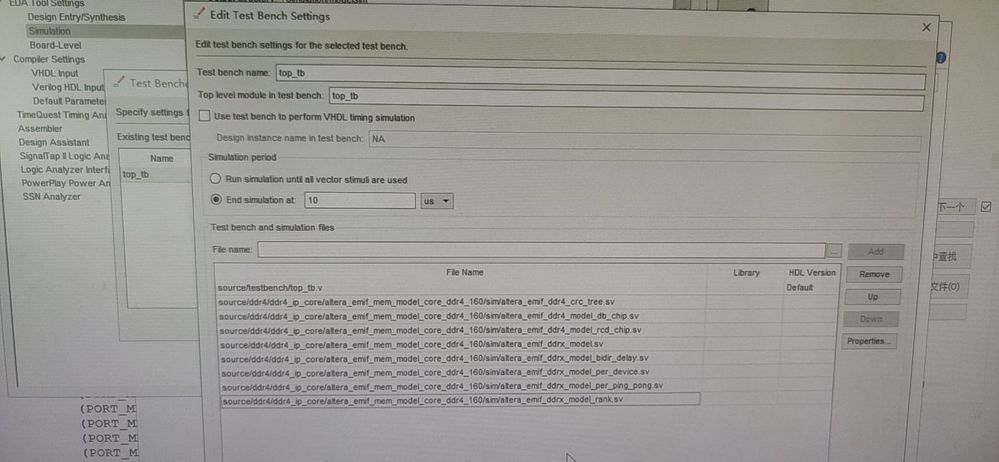 各位前辈好: 我用的quartus 16.0标准版,我想仿真DDR4 IP核,我自己写了一个DDR4相关的逻辑代码,也写了对应的仿真文件。 然后我生成了一个DDR4的example design,把里面的 ddr4 模型拿了出来,通过在设置modelsim 的时候,加了进来,如下图