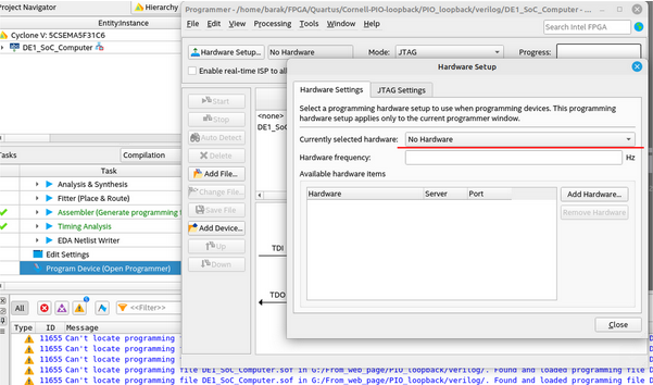 Under Hardware Setup --> Hardware Settings --> Currently selected hardware there only appears "No Hardware", and the DE1-SoC isn't listed: