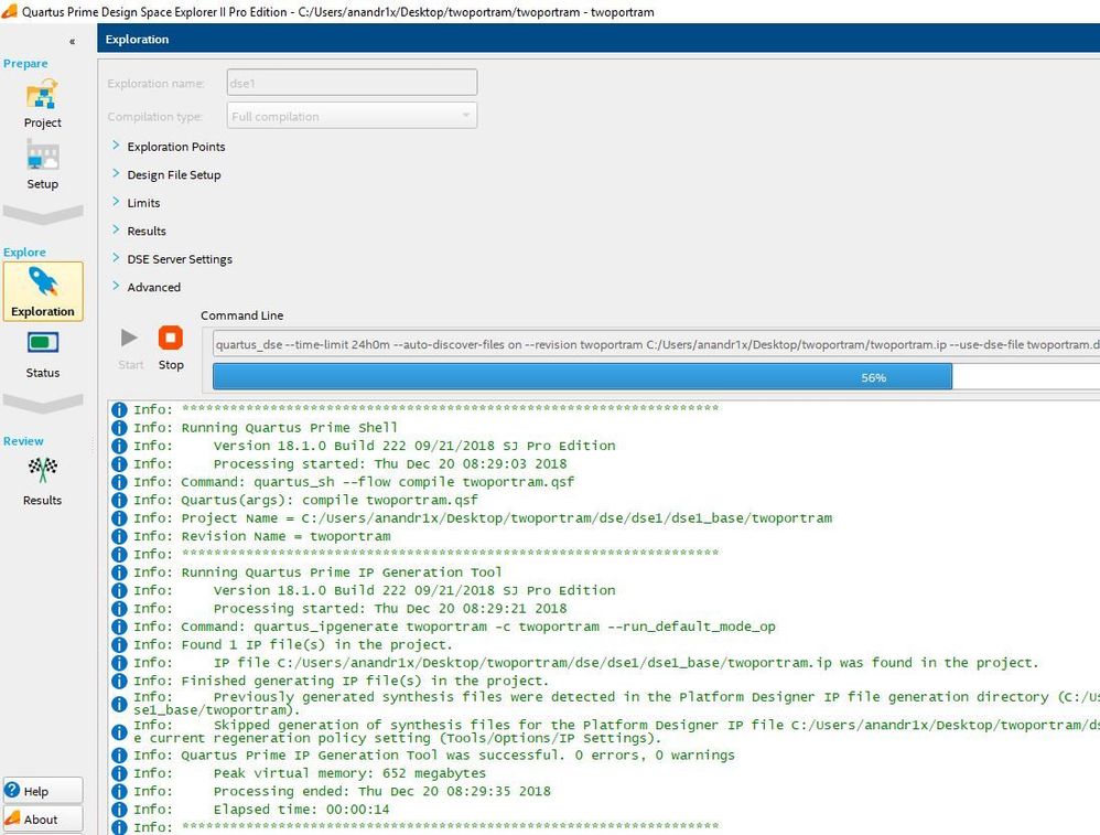 We have checked with Quartus 18.1 pro by opening project (.ip) and Started exploring the design with DSE II, by clicking on the Start which works fine.