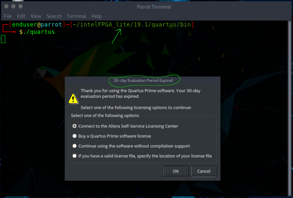 Hi, thanks, I have already installed the Intel Quartus Prime Lite v20.1, but I see that it's has the same behavior (the program appears as Standard Edition with 30 days limit) :/ In Ubuntu, Quartus Prime Lite works fine but not in Parrot OS, let me just say that both are Debian based. El lun., 22 de junio de 2020 1:21, Intel Forums <supportreplies@intel.com> escribió:- KhaiChein_Y_Intel