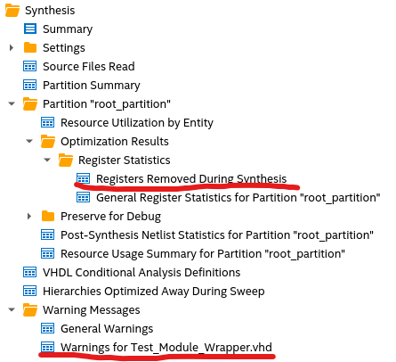 compilation report -> Synthesis -> Partition "root_partition" -> Optimization Results -> Register Statistics -> Register Removed During Synthesis