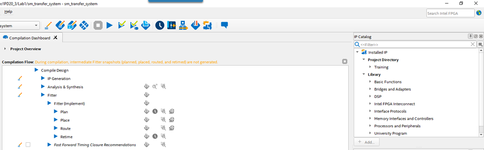 This problem does not depend on any specific project. All I have to do is open up any version of Quartus that I have, 18.1, 19.1, 20.1, or 20.1.1 and then click on the "tools" menu and then click on the "IP Catalog" menu and nothing happens.