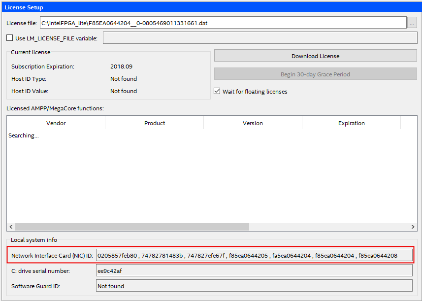 Then noticed that NIC ID in the license setup window is a comma separated list of NIC ID's present on my machine (02xxxxxxxx80 , 74xxxxxxxx3b , 74xxxxxxxx7f , f8xxxxxxxx05 , faxxxxxxxx04 , f8xxxxxxxx04 , f8xxxxxxxx08). Does license need to include all NIC IDs?