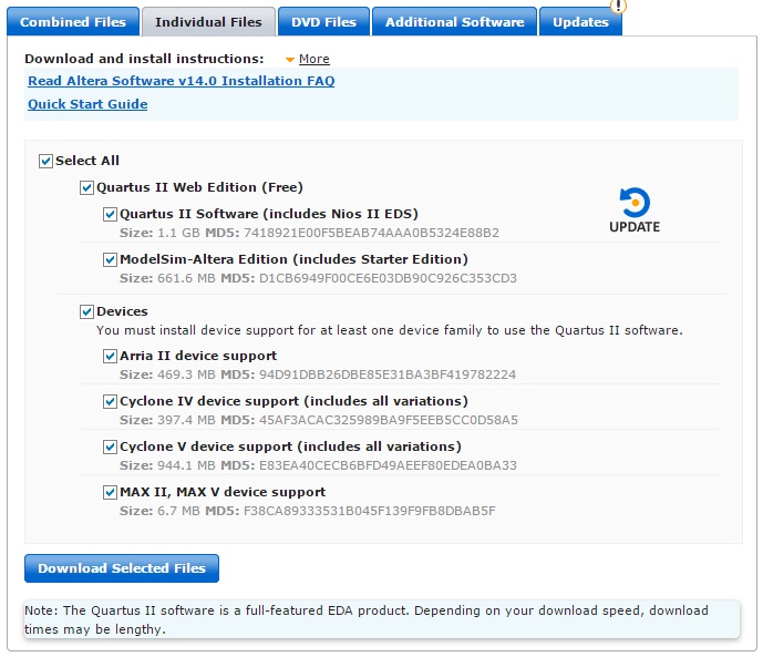And I have downloaded QuartusSetupWeb-14.0.0.20 to try the latest version of Quartus. But unfortunately, in this version of Quartus, I couldn't find the matching FPGA. How could I solve the matter? I have just downloaded as the link. There I could not find the additional option to acquire this package info. with some other way. https://www.dropbox.com/s/3zsamiv42wd870v/img.jpg?dl=0 And it seems that there are not exact matching ic from the accesible list from Quartus when I tried this with an older version. There was multiple FPGAs including "EP2AGX125EF35" but I have no idea about the additional following SYMBOLS after this "EP2AGX125EF35". Where could I have the perfect details for the product number's symbols? Thank you!!