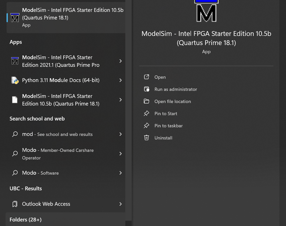 I have an Asus ROG Zephyrus Core i 9 running on Windows 11 and am required to use Quartus Prime 18.1 version. When I try to open ModelSim, I get the error: "The application was unable to start correctly (0x000007b)."