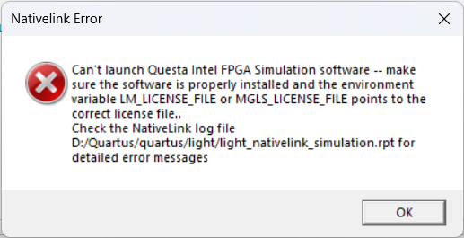 Error: Can't launch Questa Intel FPGA Simulation software -- make sure the software is properly installed and the environment variable LM_LICENSE_FILE or MGLS_LICENSE_FILE points to the correct license file.