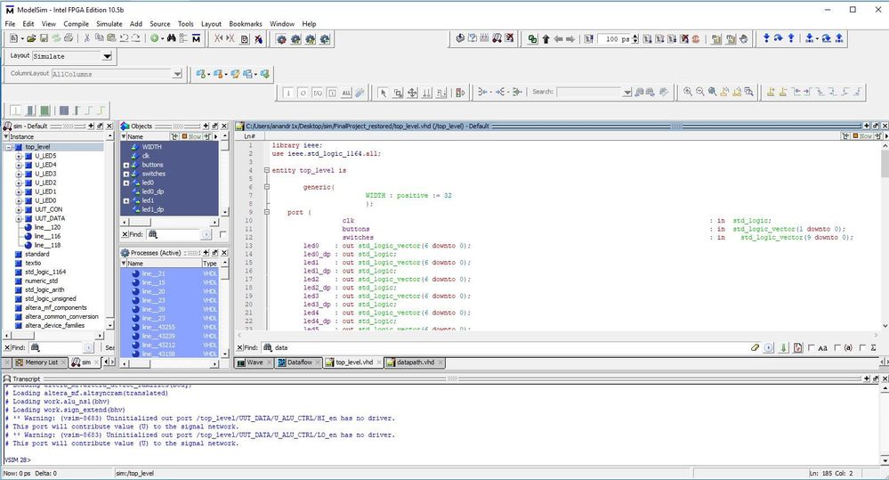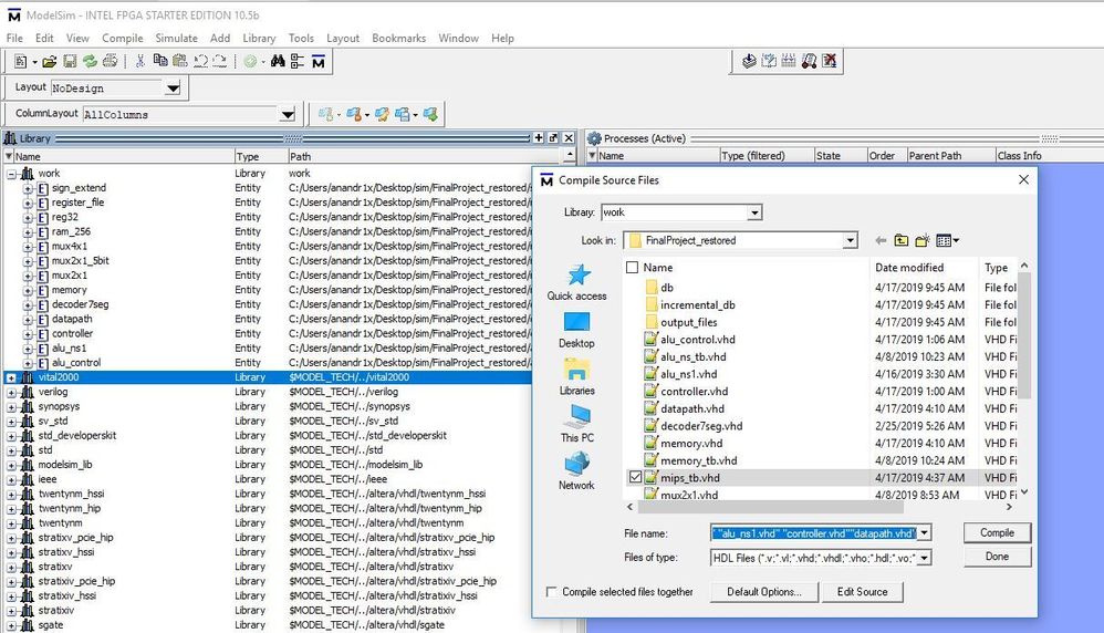 Hello, I am trying to create a testbench for a mips processor in VHDL. It compiles fine in quartus and in modelsim but when I try to start the simulation I get this error.