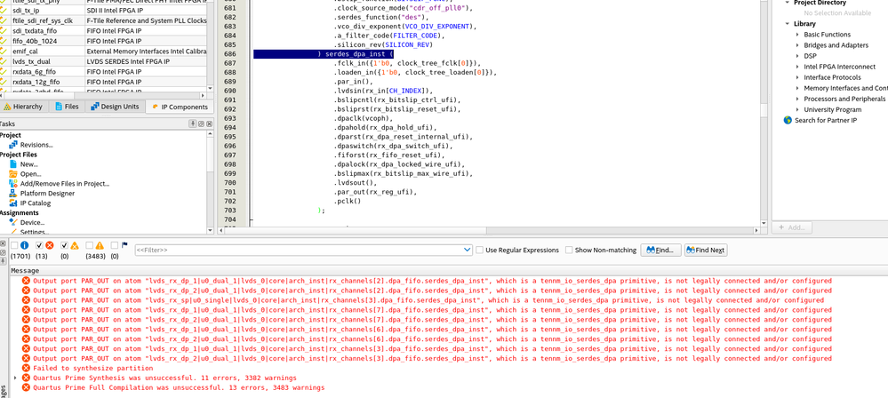 Error(129015): Output port RXDATA on atom "adc_if_0x|lvds_tile|core|arch_inst|channels[7].dpa_fifo.ioserdesdpa.serdes_dpa_inst", which is a cyclone10gx_io_serdes_dpa primitive, is not legally connected and/or configured Info(129016): Output port RXDATA[0] is disconnected, but the Compiler expects this output port to be connected Info(129016): Output port RXDATA[1] is disconnected, but the Compiler expects this output port to be connected Info(129016): Output port RXDATA[2] is disconnected, but the Compiler expects this output port to be connected Info(129016): Output port RXDATA[3] is disconnected, but the Compiler expects this output port to be connected Info(129016): Output port RXDATA[4] is disconnected, but the Compiler expects this output port to be connected Info(129016): Output port RXDATA[5] is disconnected, but the Compiler expects this output port to be connected Info(129016): Output port RXDATA[6] is disconnected, but the Compiler expects this output port to be connected Info(11951): Module instance "adc_if_0x|lvds_tile|core|arch_inst|channels[7].dpa_fifo.ioserdesdpa.serdes_dpa_inst", which is a twentynm_io_serdes_dpa primitive and belongs to an ALTLVDS interface, should have a bus width of exactly 7 connected to TXDATA port. Error(129015): Output port RXDATA on atom "adc_if_0x|lvds_tile|core|arch_inst|channels[1].dpa_fifo.ioserdesdpa.serdes_dpa_inst", which is a cyclone10gx_io_serdes_dpa primitive, is not legally connected and/or configured Info(129016): Output port RXDATA[0] is disconnected, but the Compiler expects this output port to be connected Info(129016): Output port RXDATA[1] is disconnected, but the Compiler expects this output port to be connected Info(129016): Output port RXDATA[2] is disconnected, but the Compiler expects this output port to be connected Info(129016): Output port RXDATA[3] is disconnected, but the Compiler expects this output port to be connected Info(129016): Output port RXDATA[4] is disconnected, but the Compiler expects this output port to be connected Info(129016): Output port RXDATA[5] is disconnected, but the Compiler expects this output port to be connected Info(129016): Output port RXDATA[6] is disconnected, but the Compiler expects this output port to be connected Info(11951): Module instance "adc_if_0x|lvds_tile|core|arch_inst|channels[1].dpa_fifo.ioserdesdpa.serdes_dpa_inst", which is a twentynm_io_serdes_dpa primitive and belongs to an ALTLVDS interface, should have a bus width of exactly 7 connected to TXDATA port. Error(129015): Output port RXDATA on atom "adc_if_0x|lvds_tile|core|arch_inst|channels[6].dpa_fifo.ioserdesdpa.serdes_dpa_inst", which is a cyclone10gx_io_serdes_dpa primitive, is not legally connected and/or configured Info(129016): Output port RXDATA[0] is disconnected, but the Compiler expects this output port to be connected Info(129016): Output port RXDATA[1] is disconnected, but the Compiler expects this output port to be connected Info(129016): Output port RXDATA[2] is disconnected, but the Compiler expects this output port to be connected Info(129016): Output port RXDATA[3] is disconnected, but the Compiler expects this output port to be connected Info(129016): Output port RXDATA[4] is disconnected, but the Compiler expects this output port to be connected Info(129016): Output port RXDATA[5] is disconnected, but the Compiler expects this output port to be connected Info(129016): Output port RXDATA[6] is disconnected, but the Compiler expects this output port to be connected Info(11951): Module instance "adc_if_0x|lvds_tile|core|arch_inst|channels[6].dpa_fifo.ioserdesdpa.serdes_dpa_inst", which is a twentynm_io_serdes_dpa primitive and belongs to an ALTLVDS interface, should have a bus width of exactly 7 connected to TXDATA port. Error(129015): Output port RXDATA on atom "adc_if_0x|lvds_tile|core|arch_inst|channels[15].dpa_fifo.ioserdesdpa.serdes_dpa_inst", which is a cyclone10gx_io_serdes_dpa primitive, is not legally connected and/or configured Info(129016): Output port RXDATA[0] is disconnected, but the Compiler expects this output port to be connected Info(129016): Output port RXDATA[1] is disconnected, but the Compiler expects this output port to be connected Info(129016): Output port RXDATA[2] is disconnected, but the Compiler expects this output port to be connected Info(129016): Output port RXDATA[3] is disconnected, but the Compiler expects this output port to be connected Info(129016): Output port RXDATA[4] is disconnected, but the Compiler expects this output port to be connected Info(129016): Output port RXDATA[5] is disconnected, but the Compiler expects this output port to be connected Info(129016): Output port RXDATA[6] is disconnected, but the Compiler expects this output port to be connected Info(11951): Module instance "adc_if_0x|lvds_tile|core|arch_inst|channels[15].dpa_fifo.ioserdesdpa.serdes_dpa_inst", which is a twentynm_io_serdes_dpa primitive and belongs to an ALTLVDS interface, should have a bus width of exactly 7 connected to TXDATA port. Error(129015): Output port RXDATA on atom "adc_if_0x|lvds_tile|core|arch_inst|channels[3].dpa_fifo.ioserdesdpa.serdes_dpa_inst", which is a cyclone10gx_io_serdes_dpa primitive, is not legally connected and/or configured Info(129016): Output port RXDATA[0] is disconnected, but the Compiler expects this output port to be connected Info(129016): Output port RXDATA[1] is disconnected, but the Compiler expects this output port to be connected Info(129016): Output port RXDATA[2] is disconnected, but the Compiler expects this output port to be connected Info(129016): Output port RXDATA[3] is disconnected, but the Compiler expects this output port to be connected Info(129016): Output port RXDATA[4] is disconnected, but the Compiler expects this output port to be connected Info(129016): Output port RXDATA[5] is disconnected, but the Compiler expects this output port to be connected Info(129016): Output port RXDATA[6] is disconnected, but the Compiler expects this o