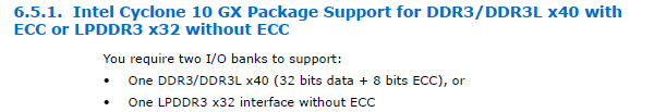 Cyclone 10 GX package only support DDR3 x40 with ECC. This information cover in “Intel® Cyclone® 10 GX Core Fabric and General Purpose I/Os Handbook” page 166.