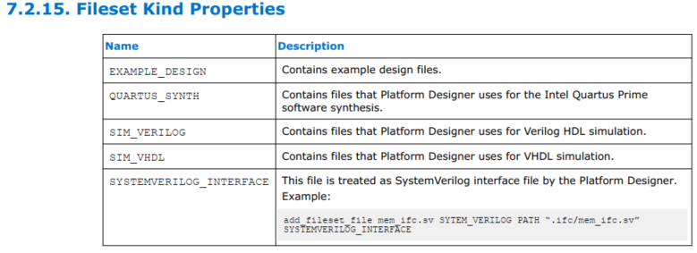 - And, the description of SYSTEMVERILOG_INTERFACE in "Fileset Kind Properties" is not consistent with the example which treated it as one of "File Kind Properties". I did try adding a fileset with type SYSTEMVERILOG_INTERFACE but it poped out an error saying it is not one of the valid fileset kind properties neither.