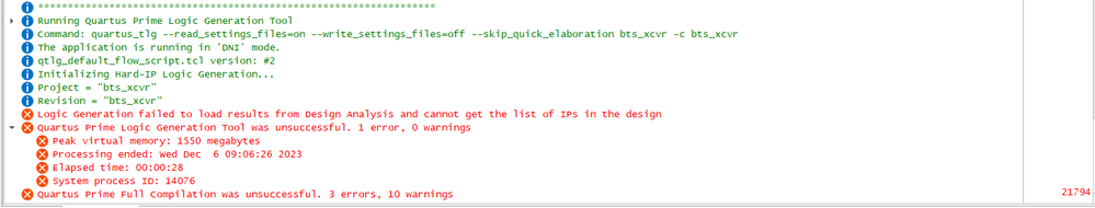 I have agilex 7 i series transceiver dev kit and i'm trying to using qsfp. There are example designs named bts_xcvr_nrz QSFDDD and bts_xcvr_pam4 QSFPDD0_1 that use qsfp. When i compiled the designs I am getting "Logic Generation failed to load results from Design Analysis and cannot get the list of IPs in the design". Also I'm adding here the error message;