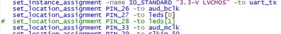 If I then, comment out the pin assignment (see for leds[1] below) and save and run the .tcl file, the FPGA will now have that output pin unassigned.