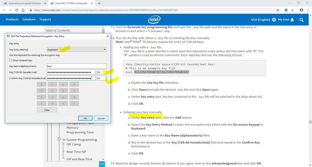 I am using Quartus Prime Ver. 18.1.0 Build 625 SJ Lite Edition to create an encrypted bitstream for MAX10 10M50DAF484C6GES device according to the procedure outlined in Intel Max10 FPGA Configuration User Guide, AES Encryption, Generating .ekp File and Encrypt Configuration File. available at https://www.intel.com/content/www/us/en/programmable/documentation/sss1393988509894.html#sss1415685487643 Steps 1 to 10 work fine.