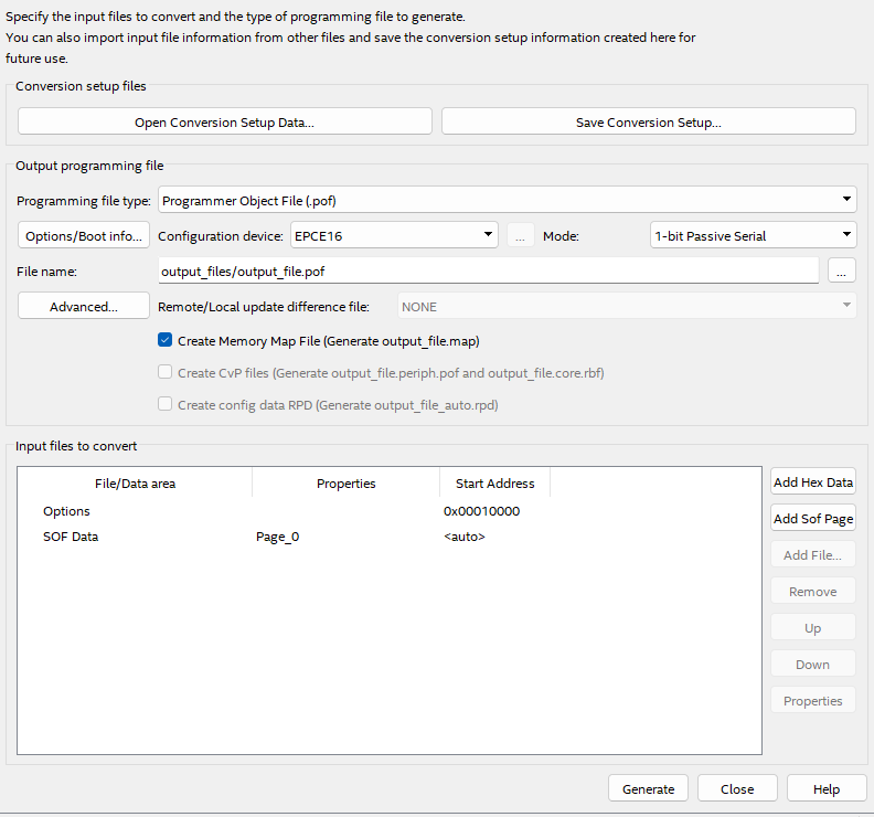 Next, in the Quartus IDE, I found File -> Convert Programming Files. This utility can generate an RBF file (Raw Binary File), which is EXACTLY what I need. I selected output file type "Raw Binary File (.rbf)", selected the compiled SOF file as the input, and clicked Generate. This gives me the vague error message "Device 10M02SCE144 does not support selected configuration mode". Playing around with lots of settings, I never could get it to generate an RBF file for me.