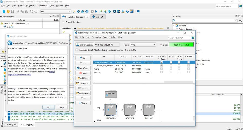 I was able to scan the jtag chain and program both sof/jic file successfully, Also change or view the Devices and Pins option.